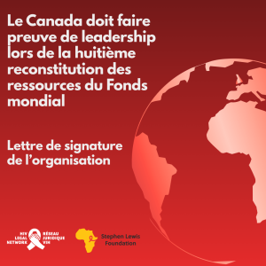 Le Canada se prépare à renouveler son engagement triennal au Fonds mondial et vous pouvez lui rappeler l’importance vitale de son leadership sur la scène internationale. Si votre organisation œuvre auprès de communautés touchées par le VIH et le sida, la tuberculose ou le paludisme, ou si elle milite pour les droits de la personne et la justice en santé, nous vous invitons à signer cette lettre ouverte qui exhorte le gouvernement du Canada à maintenir son leadership en s’engageant à verser 457 millions de dollars canadiens par année (1,37 milliard de dollars canadiens sur trois ans) pour la huitième reconstitution des ressources du Fonds mondial.